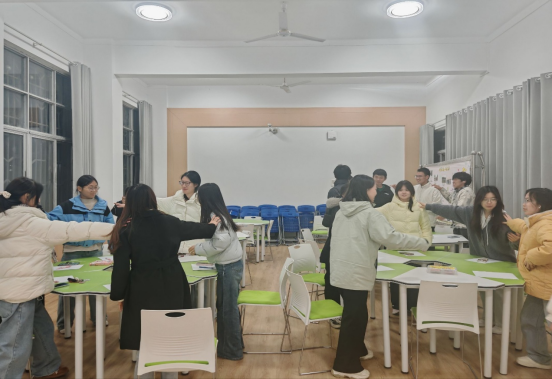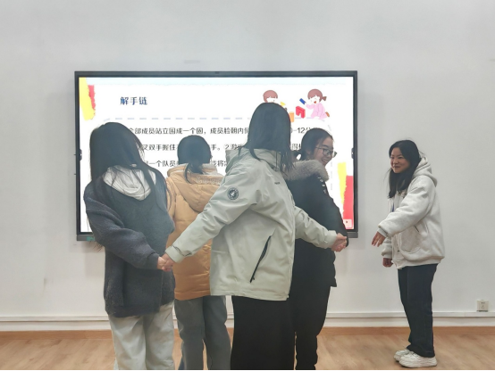 培训伊始,“吸引力”热身游戏就点燃了全场氛围。当引导者随机喊出“吸第三排穿黑色外套的同学”“吸讲台旁的粉笔盒”时,原本分散坐着的学生迅速反应,纷纷伸出右手搭在相邻同伴肩上,短短几分钟,培训现场已经热火朝天。热身过后,培训进入核心互动环节,三个精心设计的游戏——“确定团队队名”“坐地起身”“解手链”“选定班歌”,让心理委员们在实践中触摸凝聚力的真正含义。